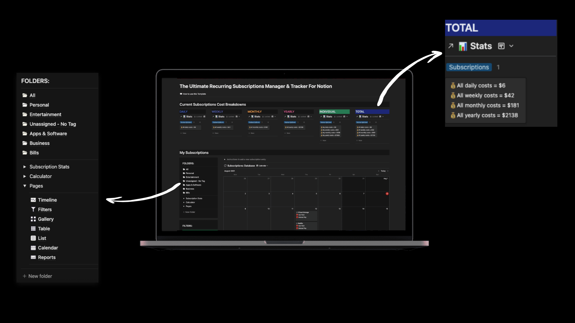 [LIFETIME ACCESS] - With this complete & customizable Notion template, you'll be able to easily track what subscriptions of yours are active/inactive, when they're due, and how much they cost on a daily, weekly, monthly, and yearly cost breakdown. Get the template and start customizing in minutes! For a small fee (about the price of a slice of pizza 🍕 ), you can download this template and start making cost-effective, sensible decisions about your subscriptions without ever forgetting or overpaying for un-used subscriptions again. 30-day money-back guarantee & all future updates included. All future updates includedImmediate DownloadEarly Bird Pricing